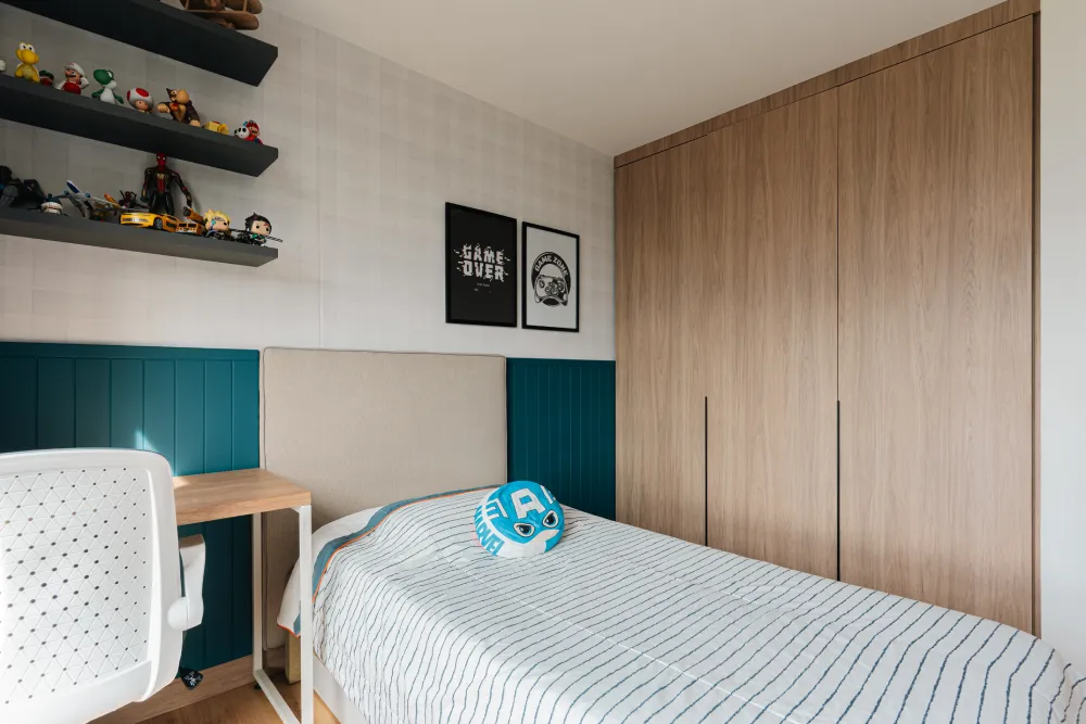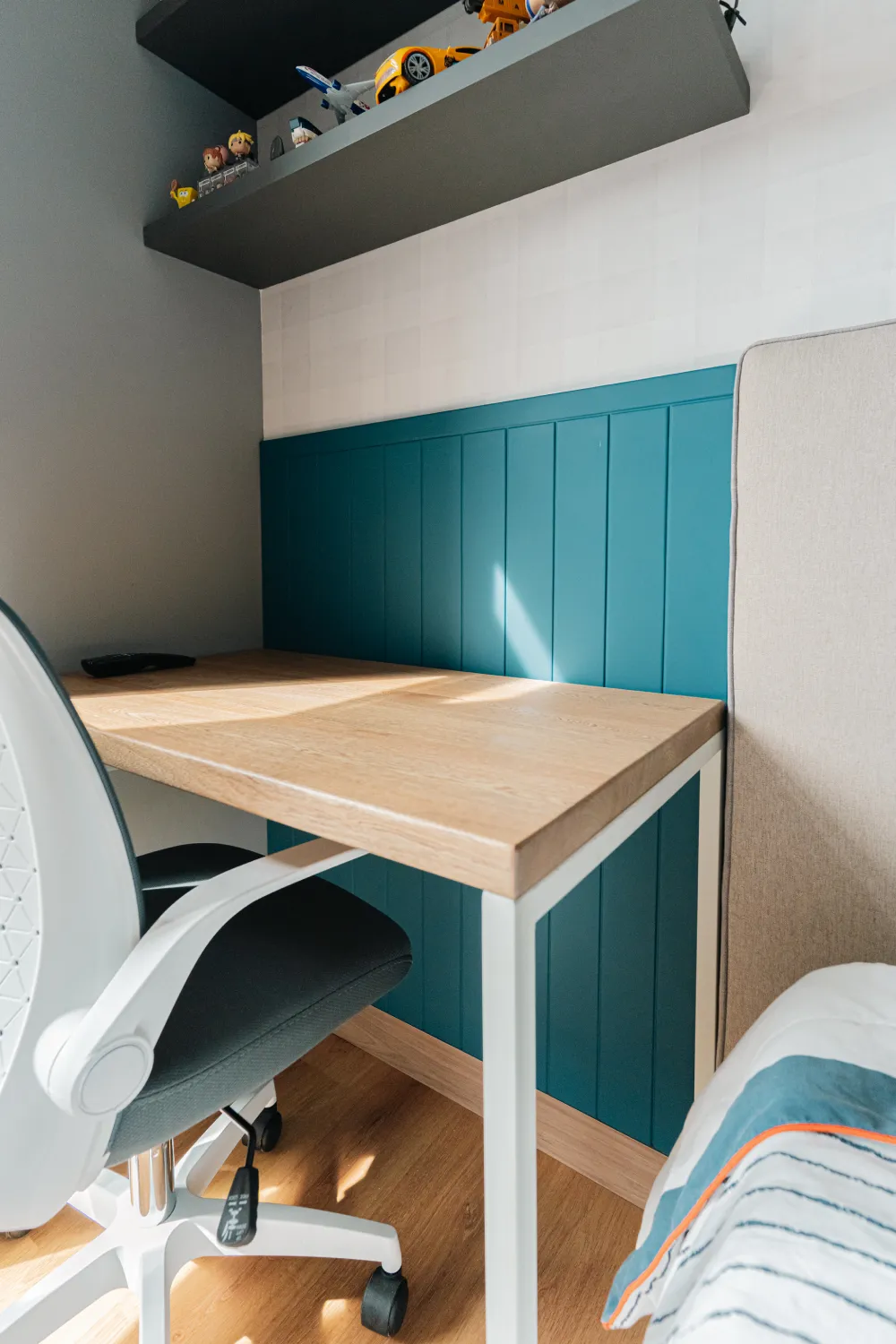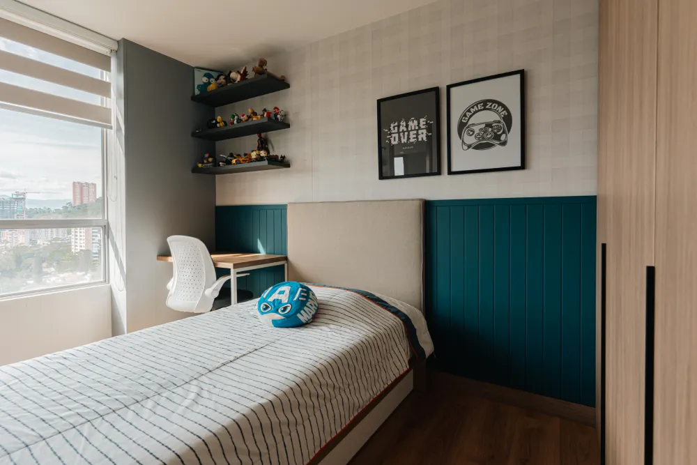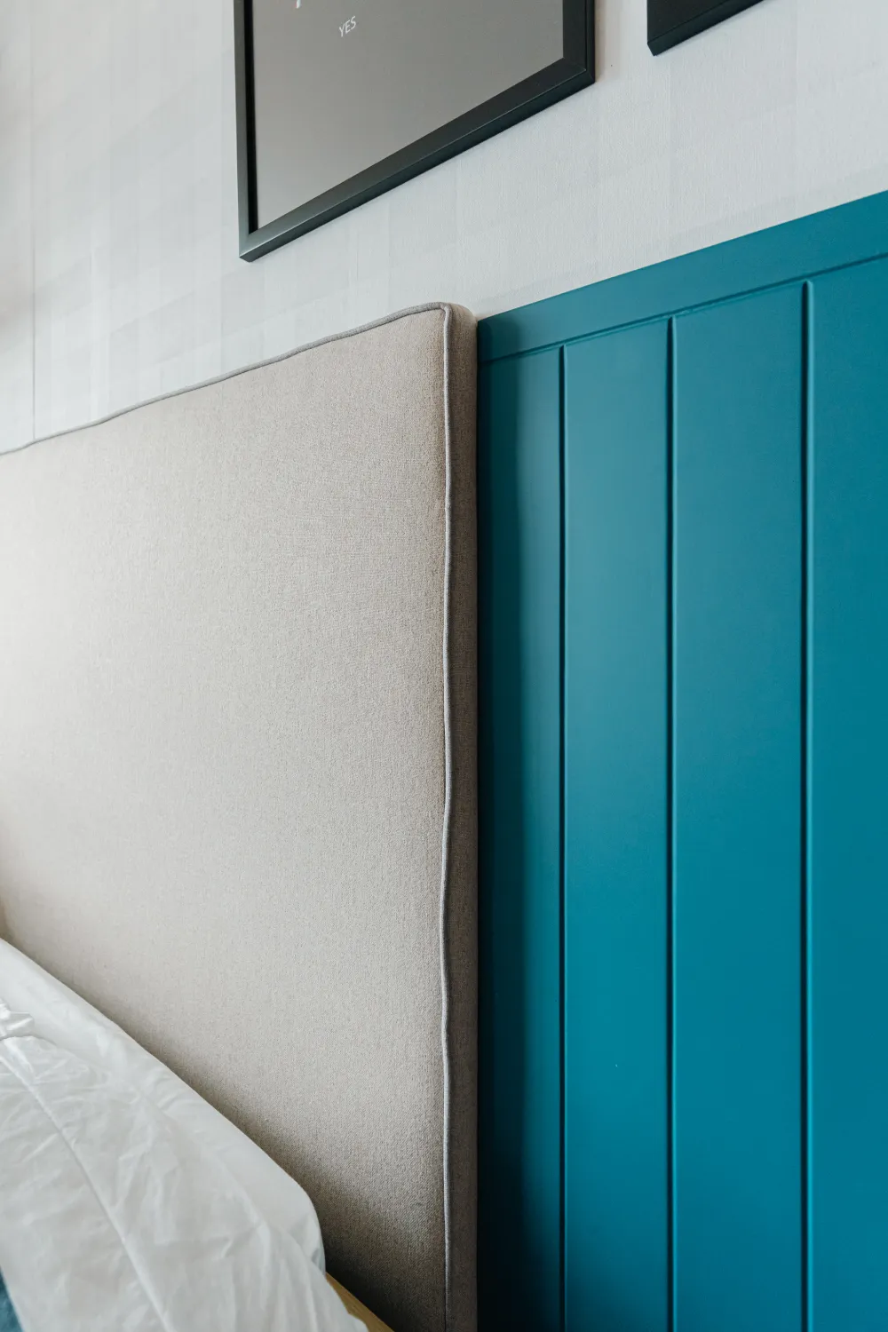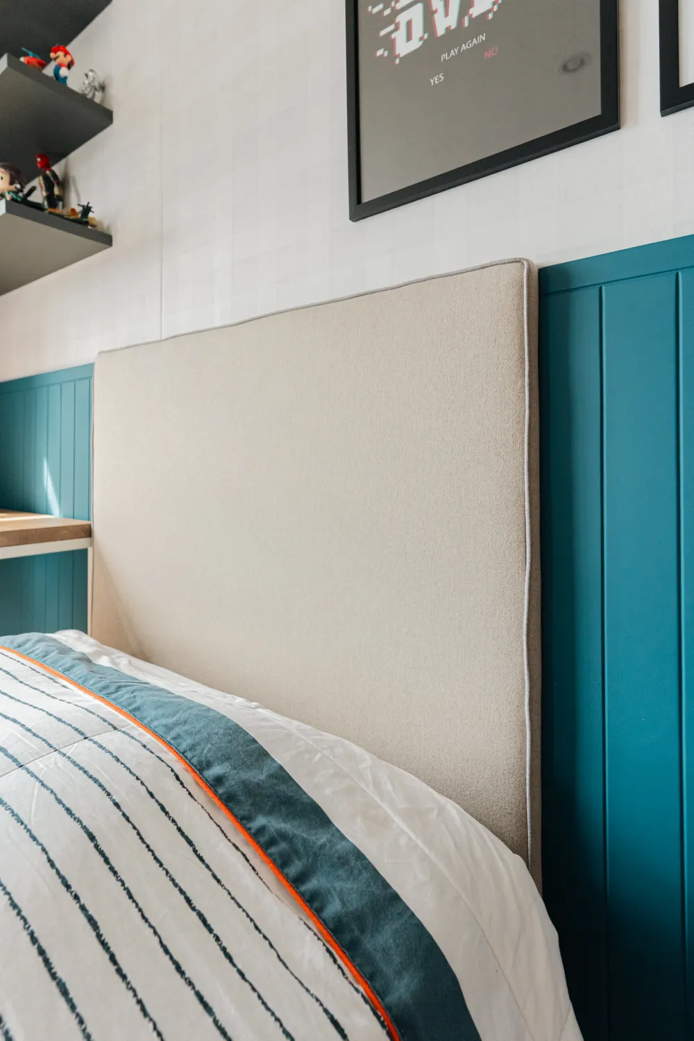 Cabecero tapizado de diseño simple y acogedor, perfecto para habitaciones infantiles o juveniles. Su forma recta y su textura suave aportan tranquilidad y comodidad al espacio, creando un ambiente armónico y fácil de combinar con cualquier estilo.