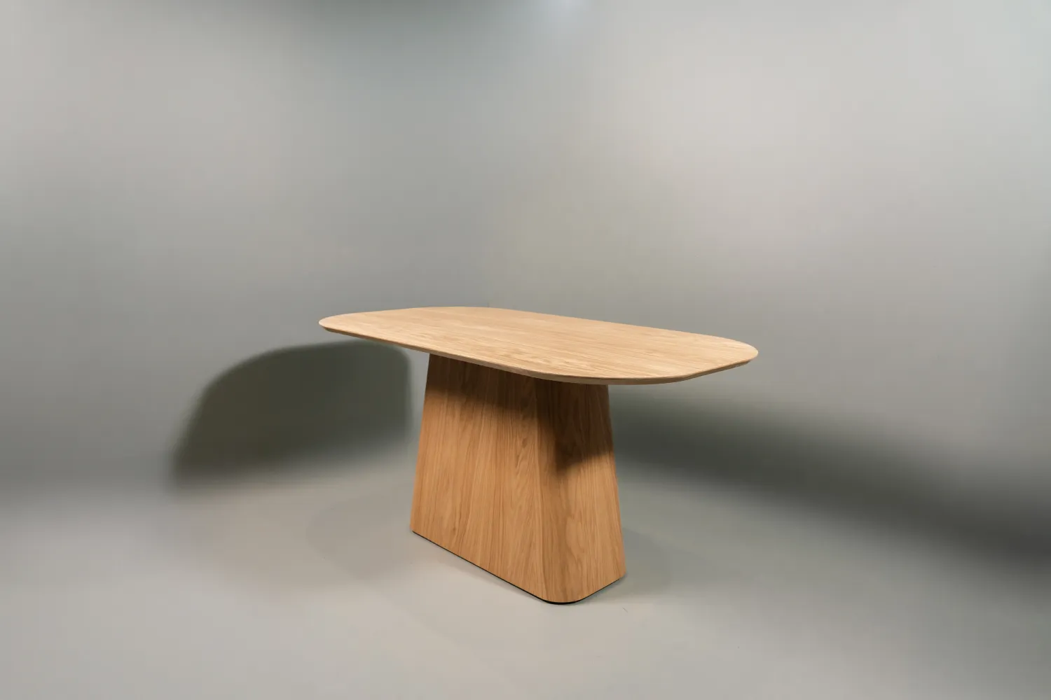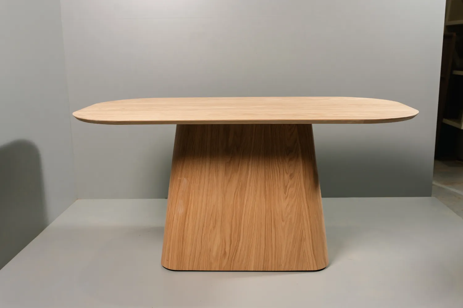 Con líneas suaves y una base robusta, esta mesa en madera maciza aporta equilibrio entre diseño contemporáneo y calidez atemporal. Ideal para espacios que buscan funcionalidad sin renunciar a la estética.