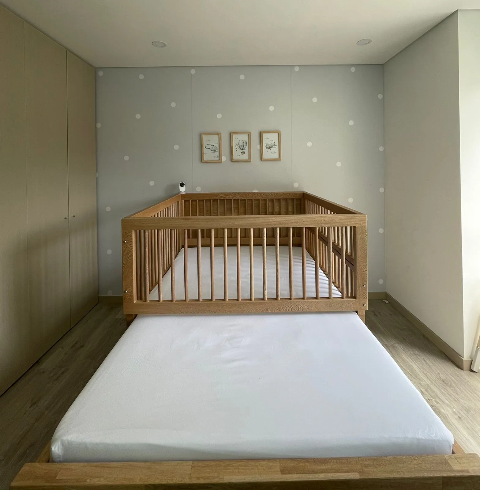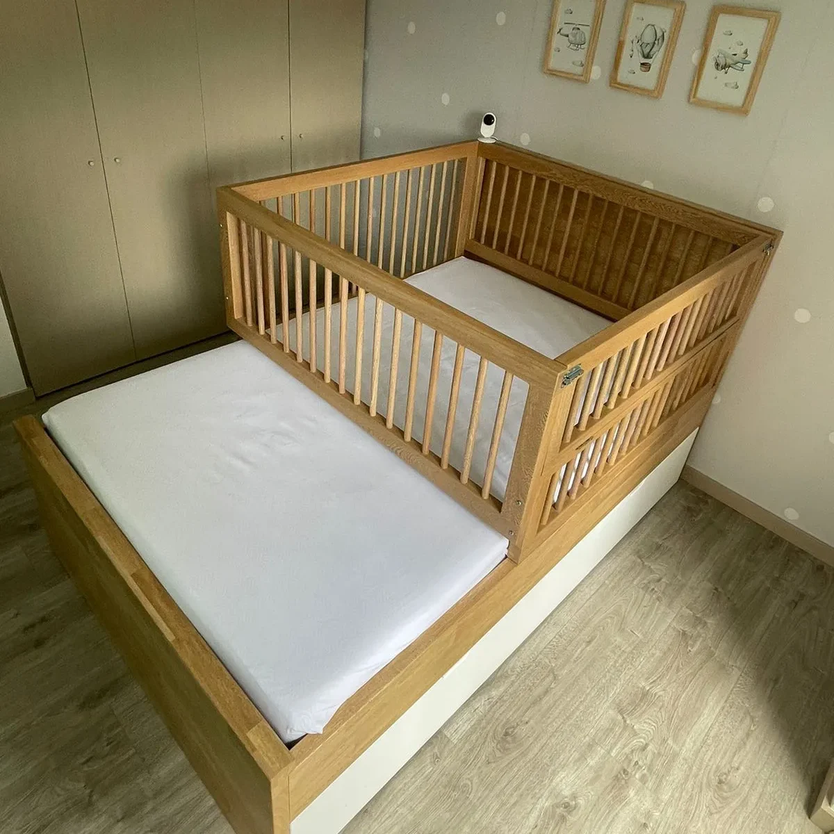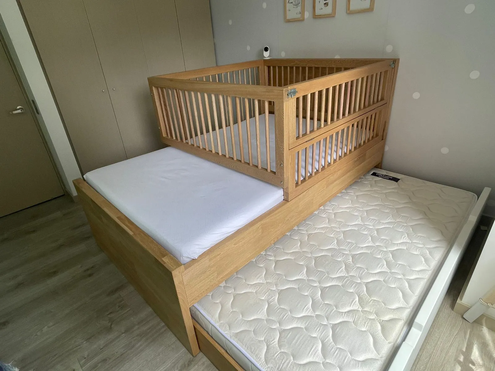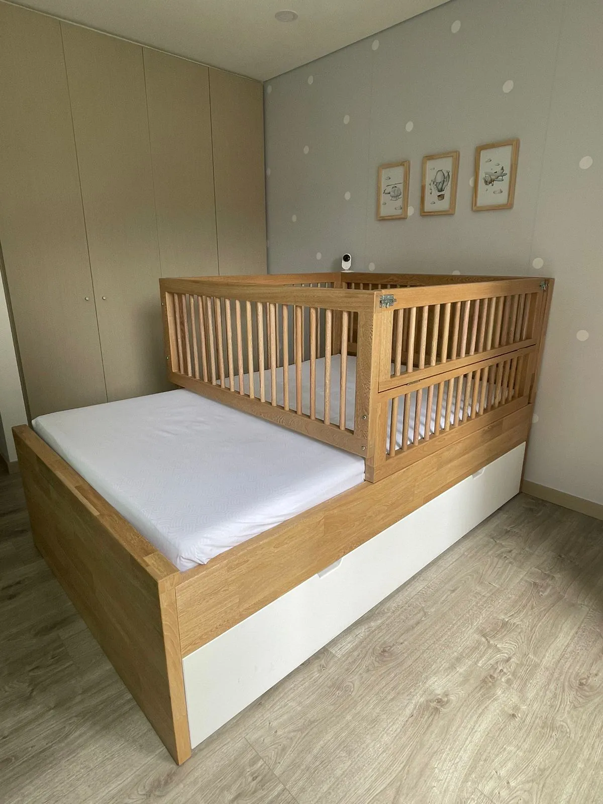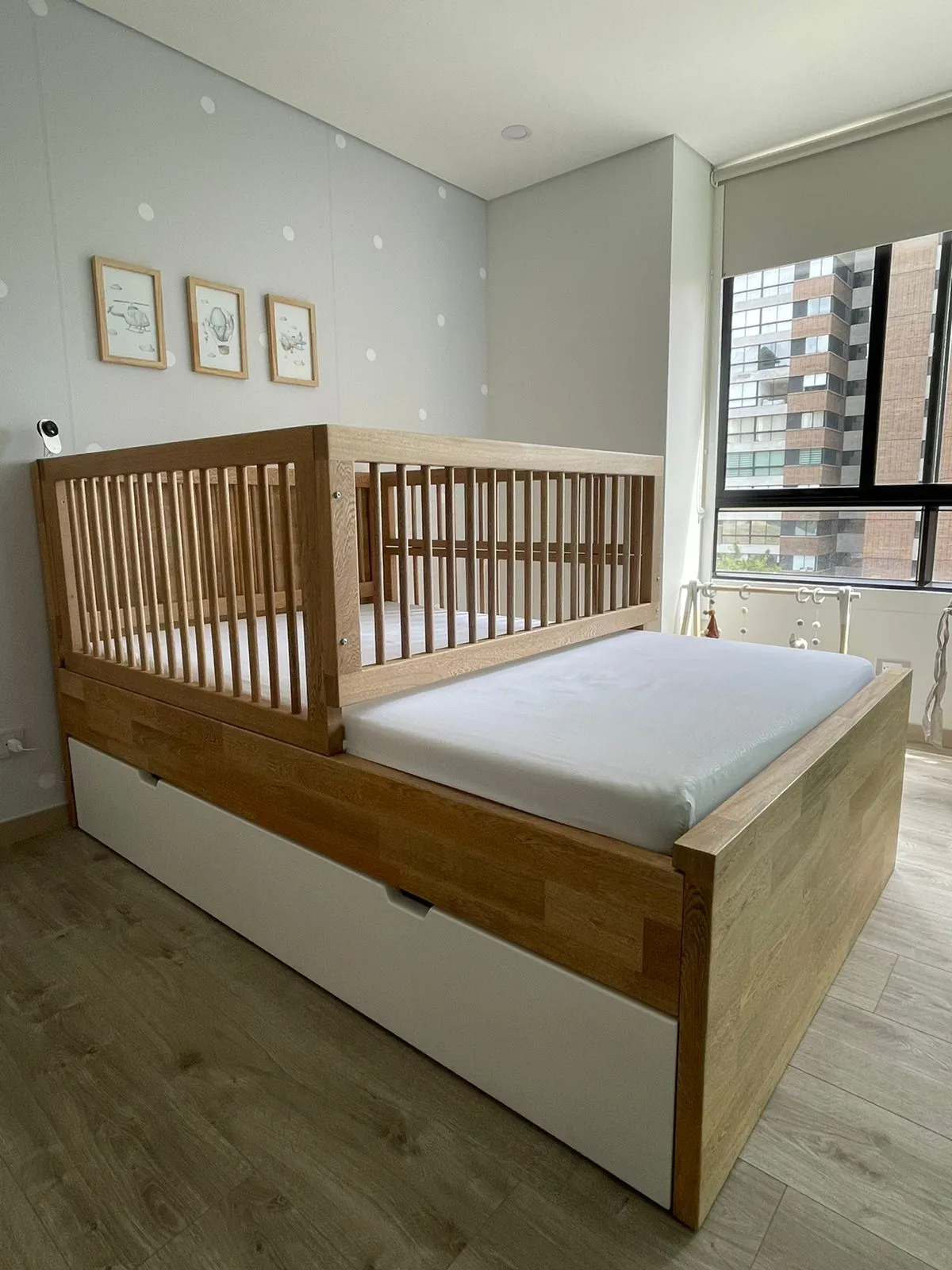Diseñada para crecer con tu hijo, esta práctica cuna de roble incluye una cama auxiliar integrada. Su estructura robusta y acabados naturales aportan calidez y funcionalidad al espacio, ofreciendo seguridad y comodidad en cada etapa.