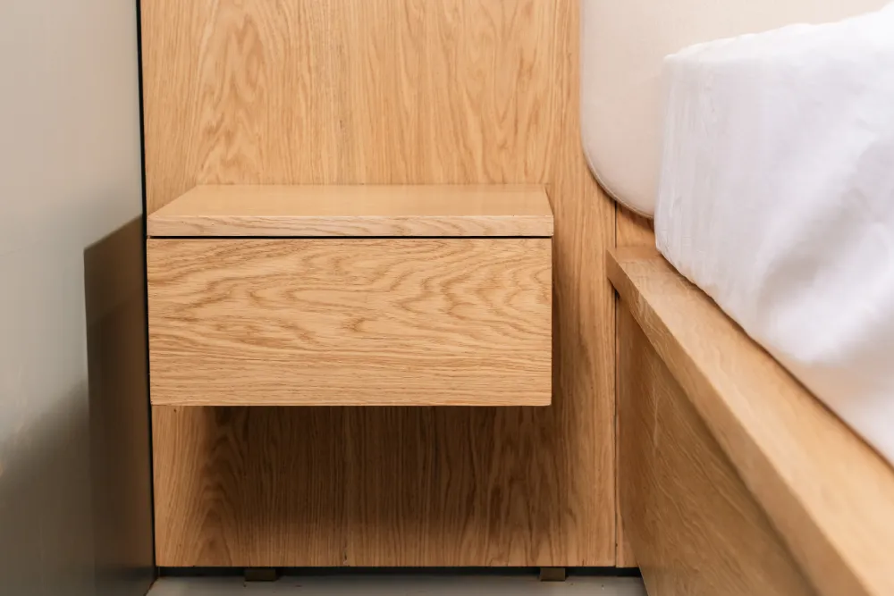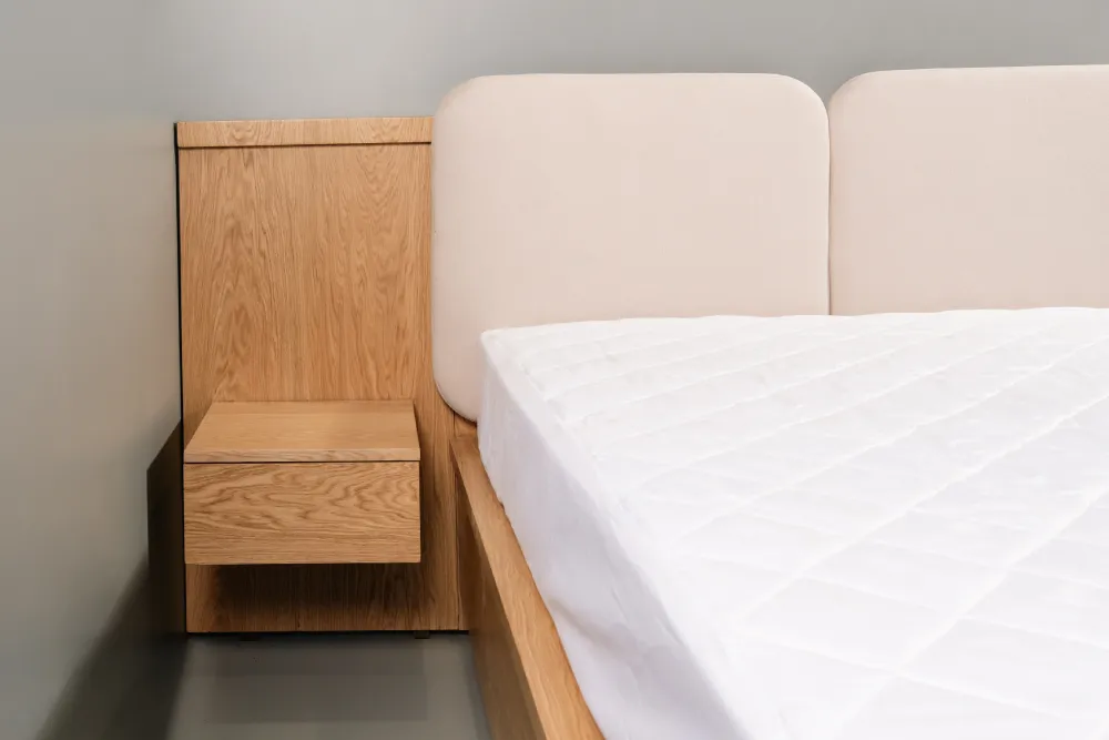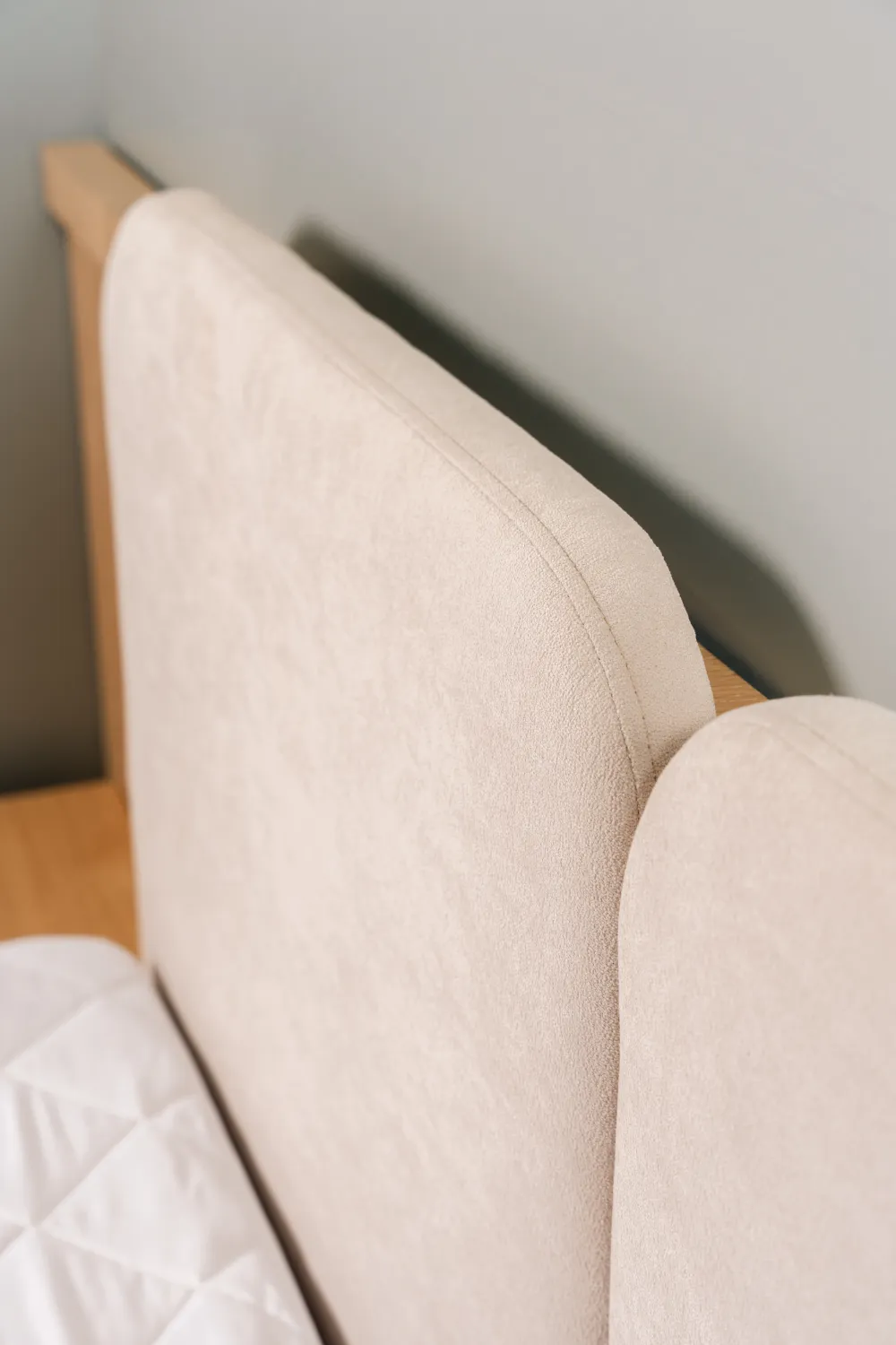 Cabecero que combina madera natural con dos paneles tapizados de bordes redondeados, logrando un equilibrio perfecto entre suavidad y estructura. Su diseño integrado con las mesas de noche aporta armonía, calidez y un estilo moderno ideal para cualquier dormitorio contemporáneo.