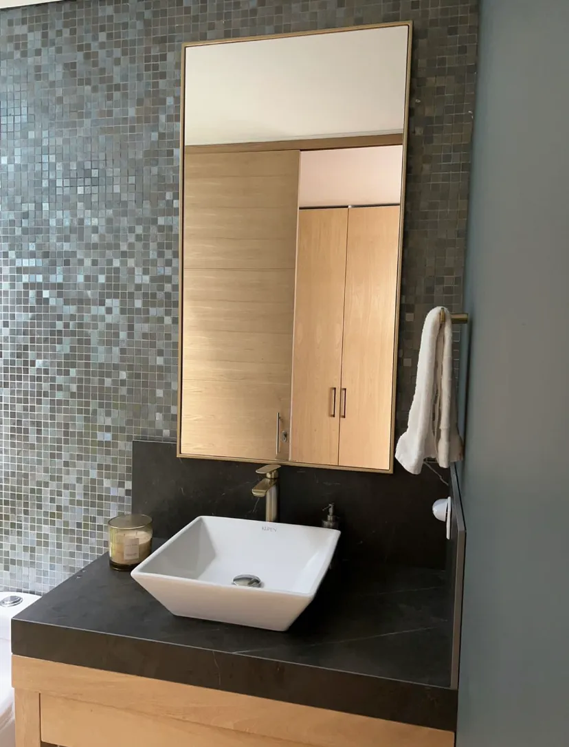 Con un diseño limpio y elegante, este espejo rectangular enmarcado en un borde metálico delgado aporta amplitud y modernidad al espacio. Perfecto para baños, tocadores o entradas, combina practicidad con un estilo contemporáneo y versátil.