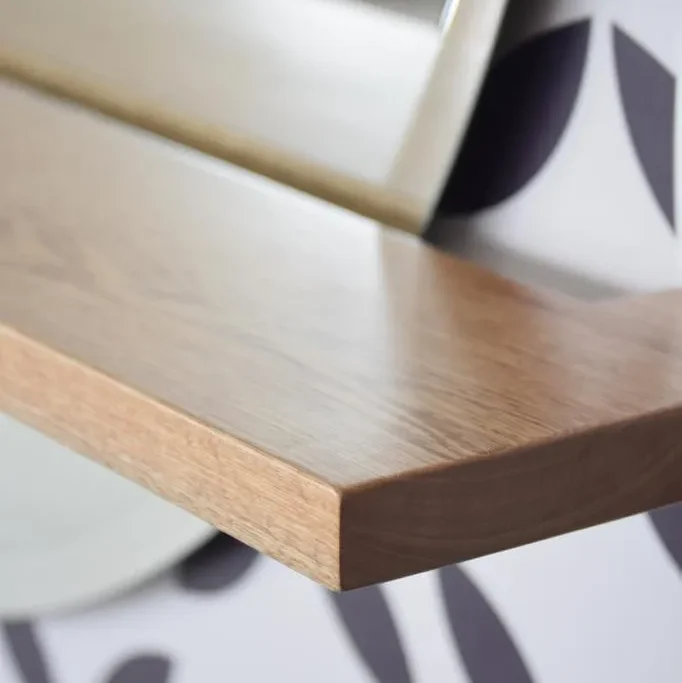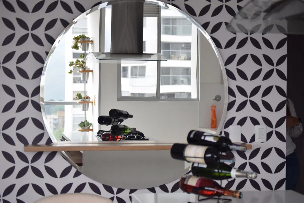 Un diseño funcional y decorativo que combina un espejo redondo con una repisa discreta, ideal para colocar objetos decorativos, botellas o plantas pequeñas. Perfecto para dar amplitud al espacio mientras aporta un toque moderno y práctico a cocinas, comedores o recibidores.