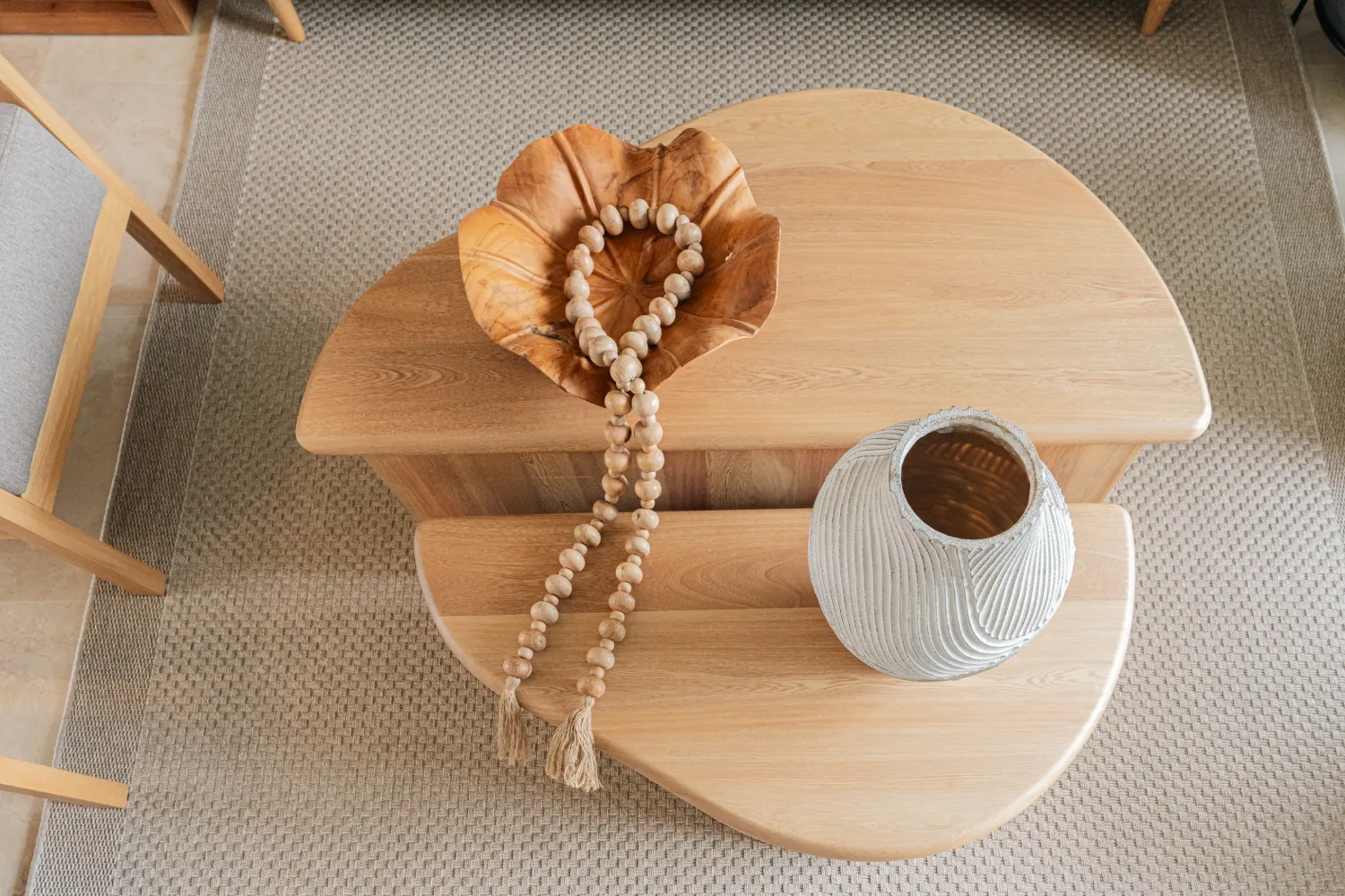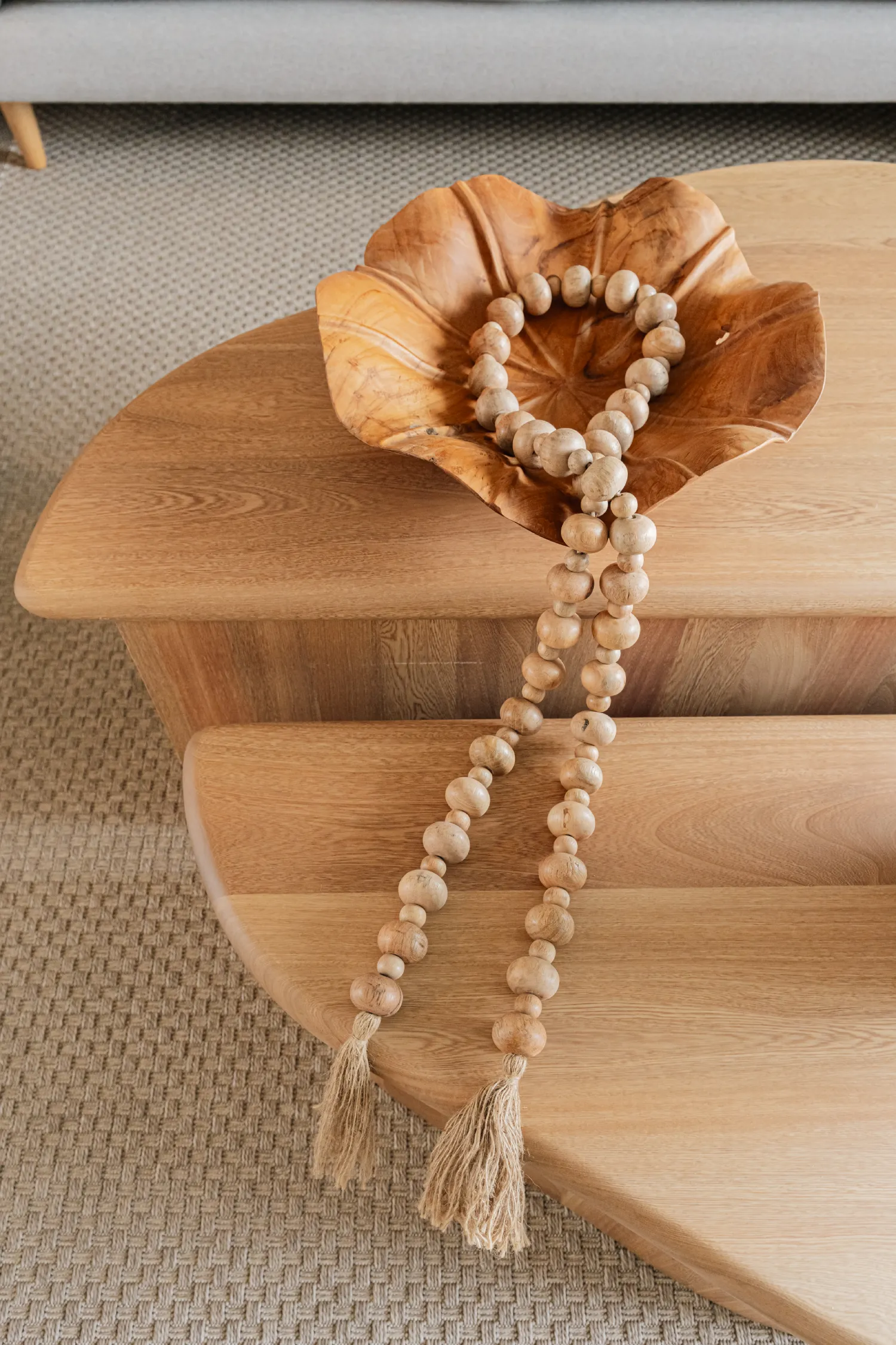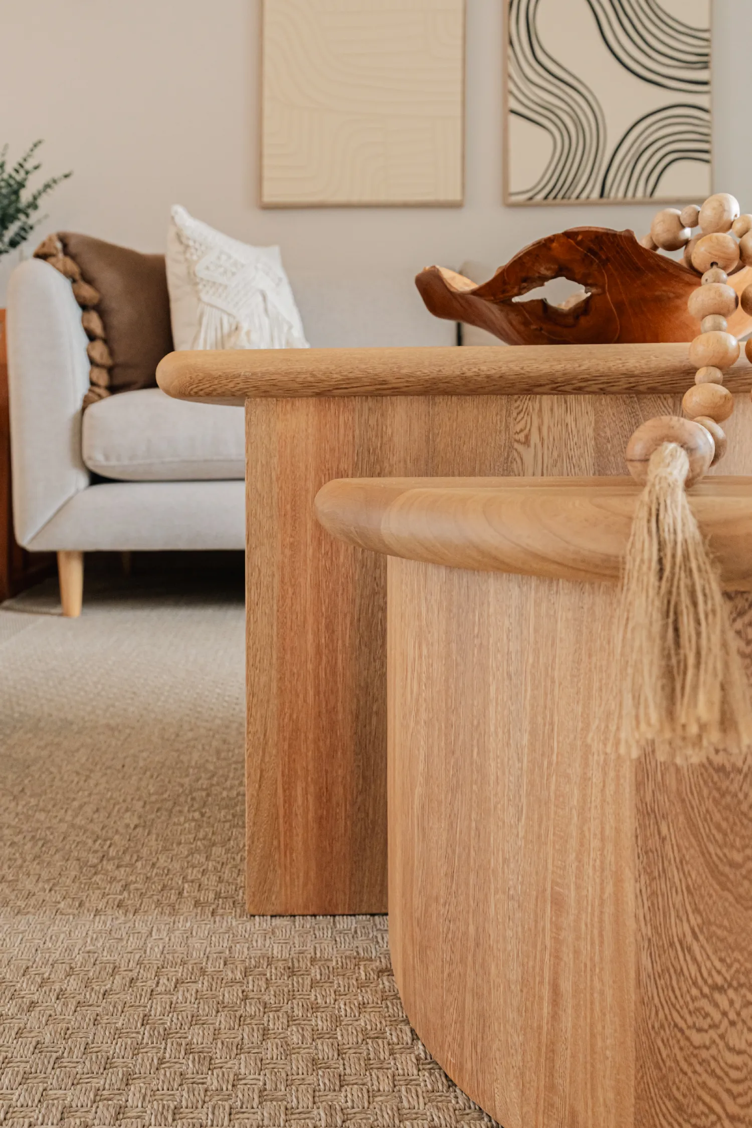 Diseño orgánico, presencia escultórica. Este dúo de mesas en madera sólida destaca por sus líneas suaves y formas fluidas que evocan la naturaleza. Una pieza central que transforma cualquier sala en un espacio sofisticado, cálido y lleno de estilo contemporáneo.