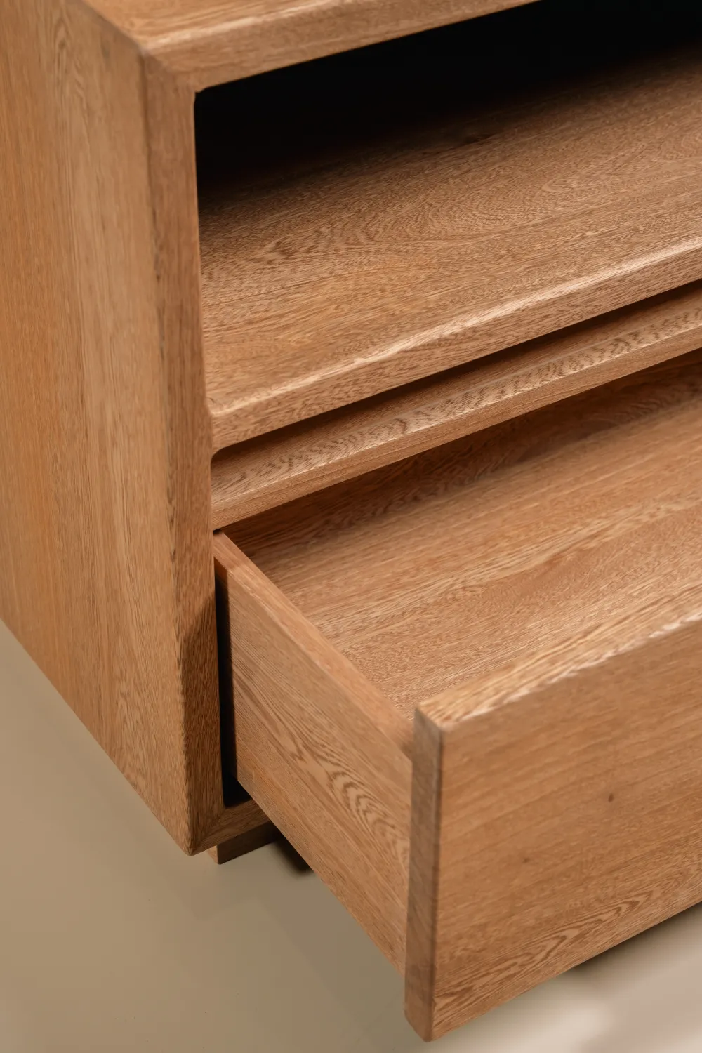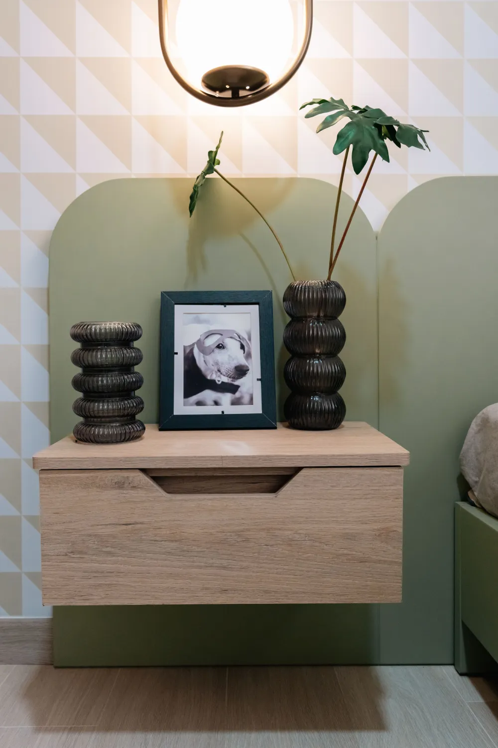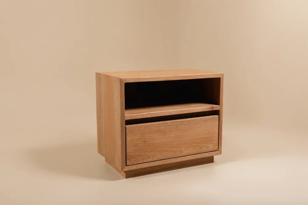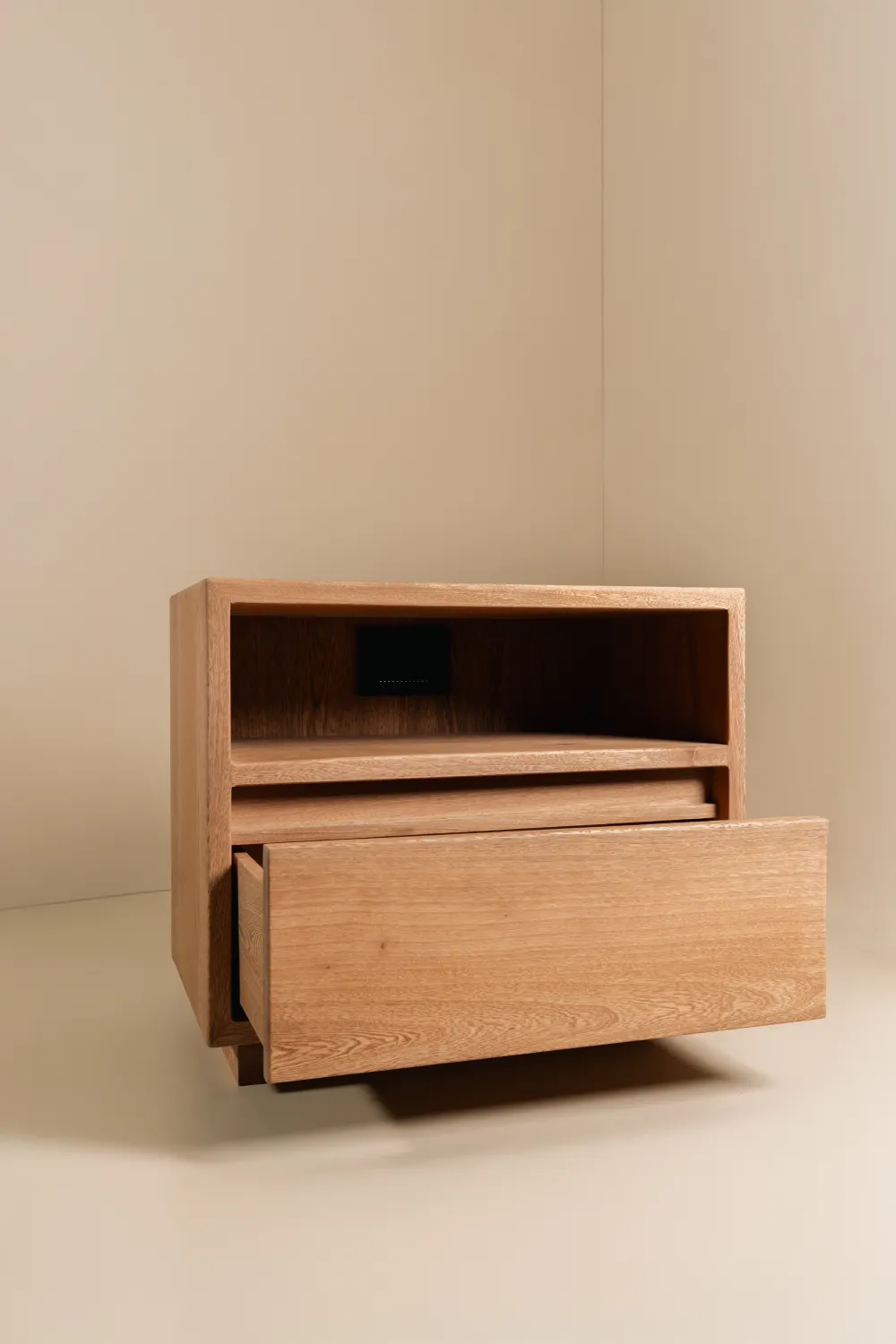 Diseño limpio, funcionalidad total. La Mesa de Noche Terra se instala directamente en la pared, aportando ligereza visual y mayor amplitud al espacio. Su acabado en madera natural y el tirador integrado le dan un toque moderno y minimalista, ideal para dormitorios contemporáneos.