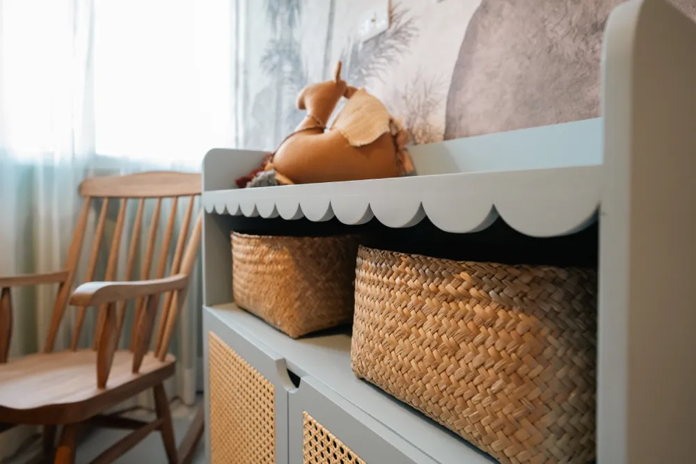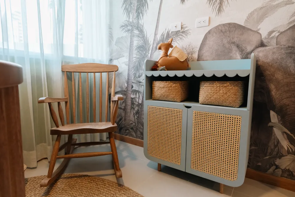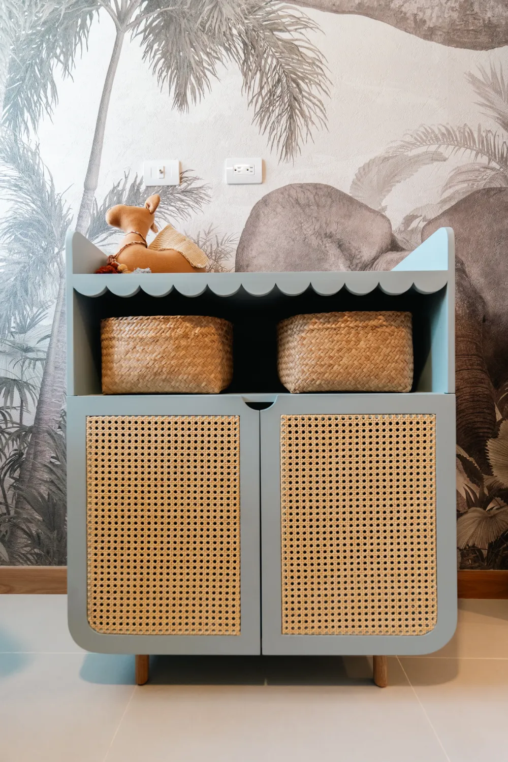 Un mueble infantil encantador y funcional, diseñado con detalles suaves y un estilo que ilumina cualquier habitación. Su estructura combina madera pintada con puertas en rattan natural, creando una pieza cálida y moderna. Cuenta con espacio superior para organizar