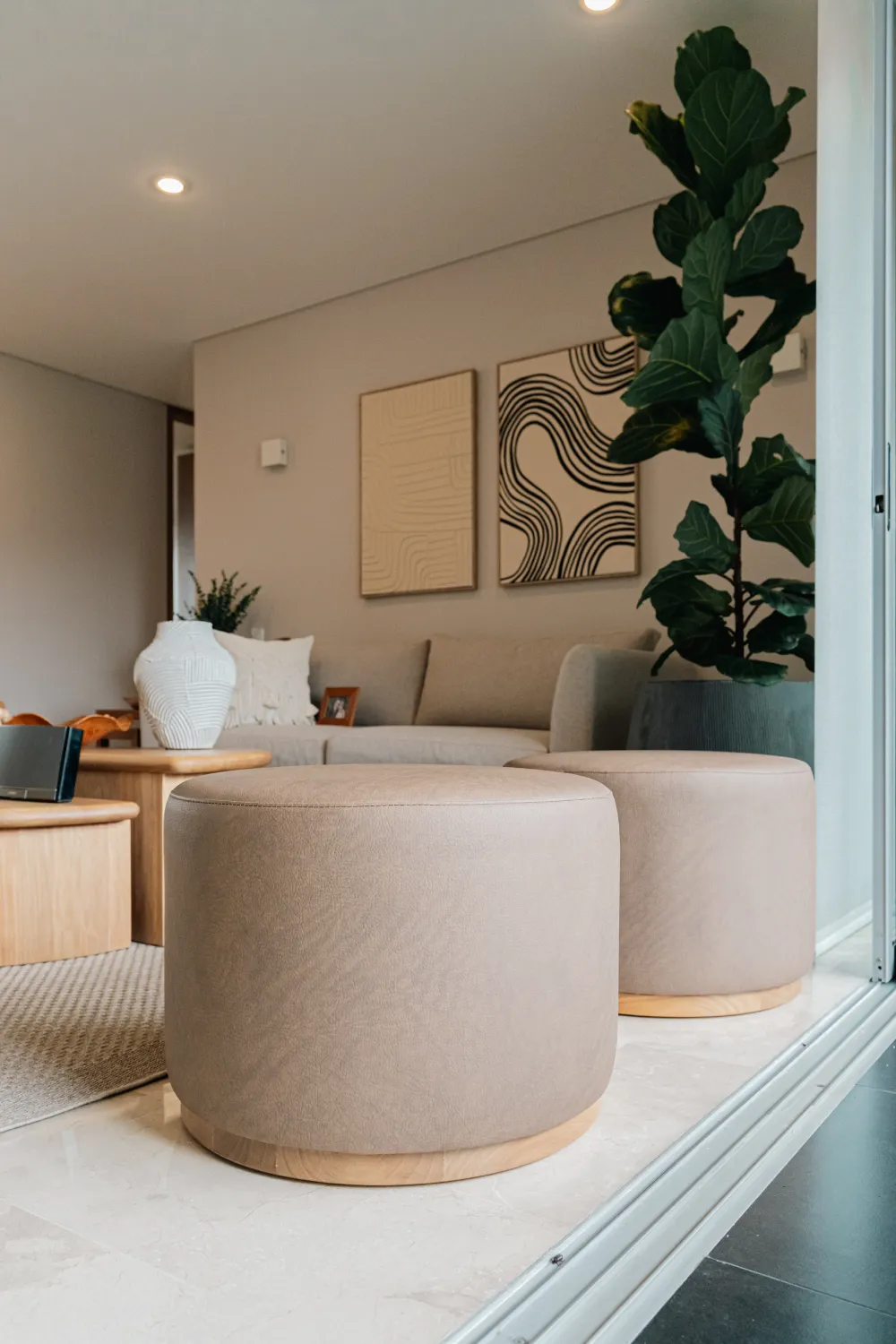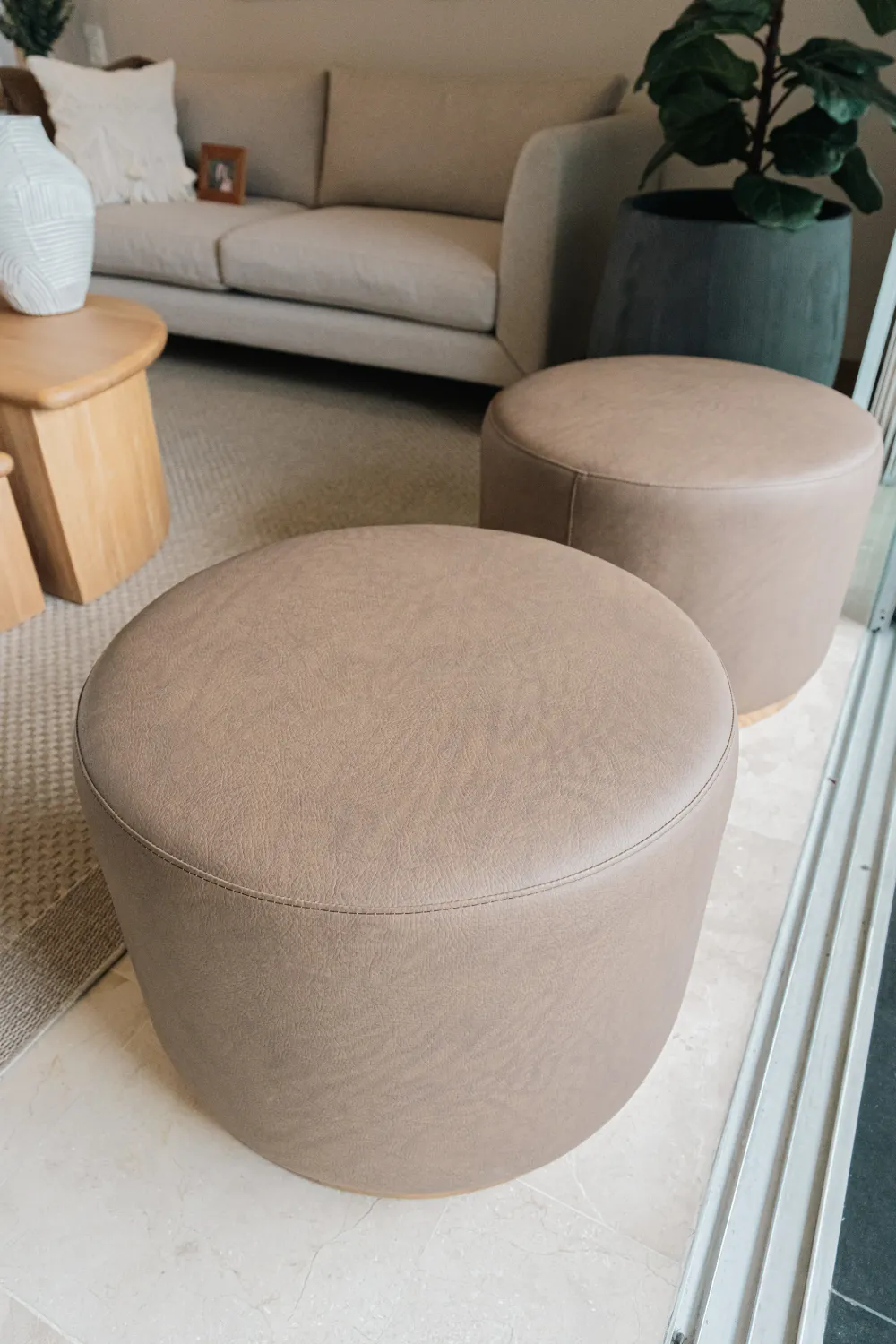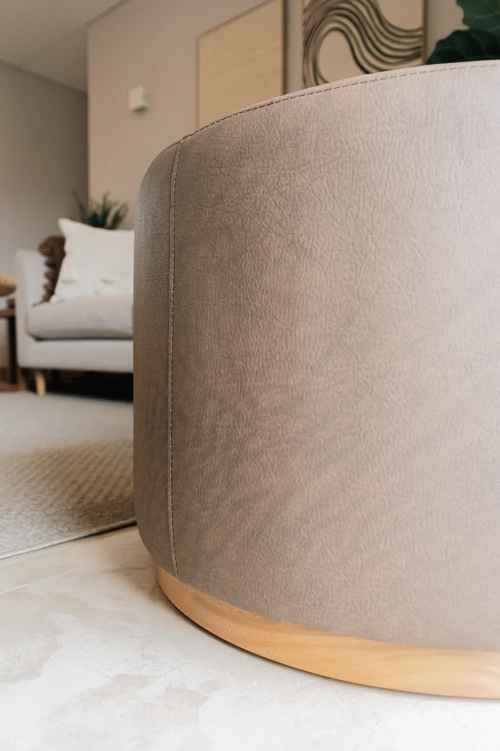 Puff cilíndrico de diseño moderno con base en madera natural. Su forma suave y tapizado envolvente lo convierten en una pieza versátil: perfecto como asiento adicional, apoyo para los pies o acento decorativo en salas y terrazas. Un toque elegante y funcional que aporta calidez a cualquier espacio.