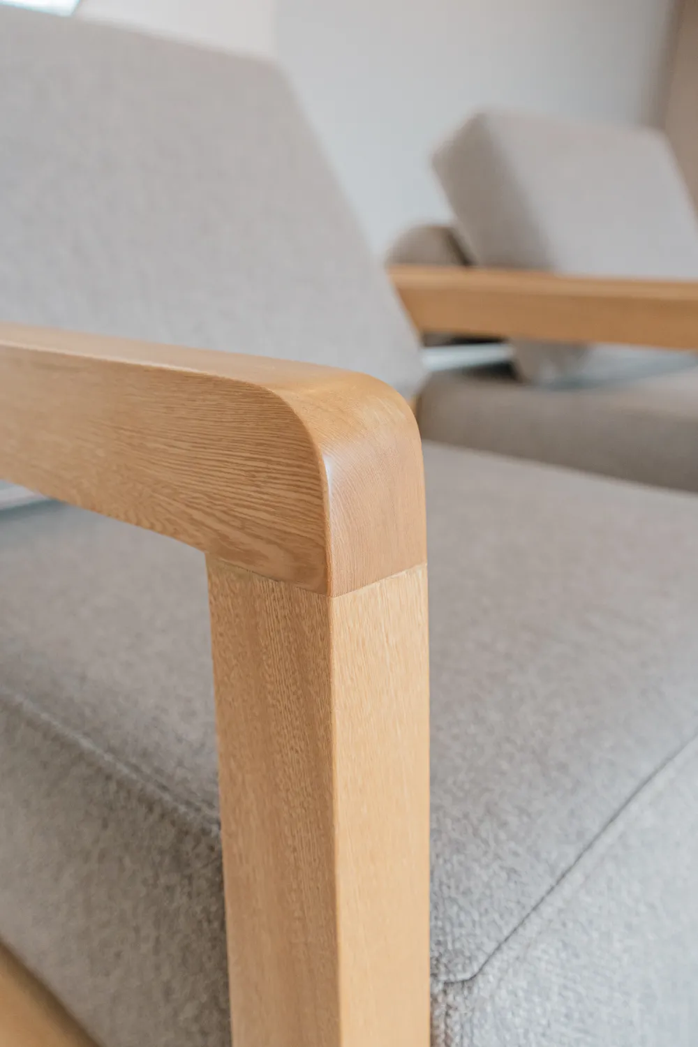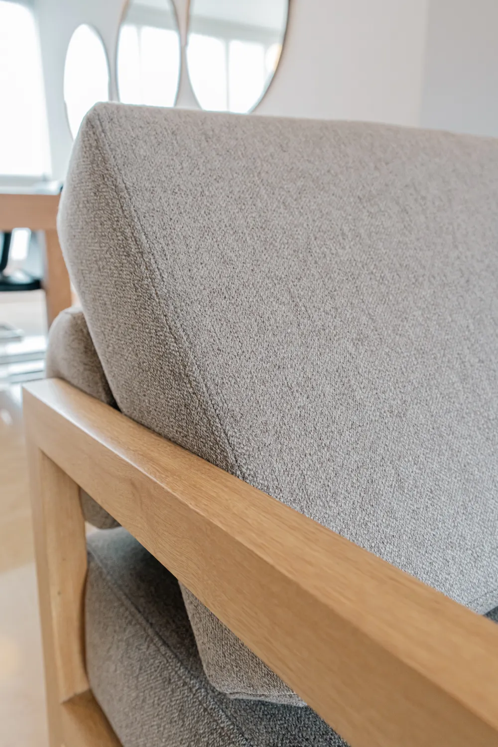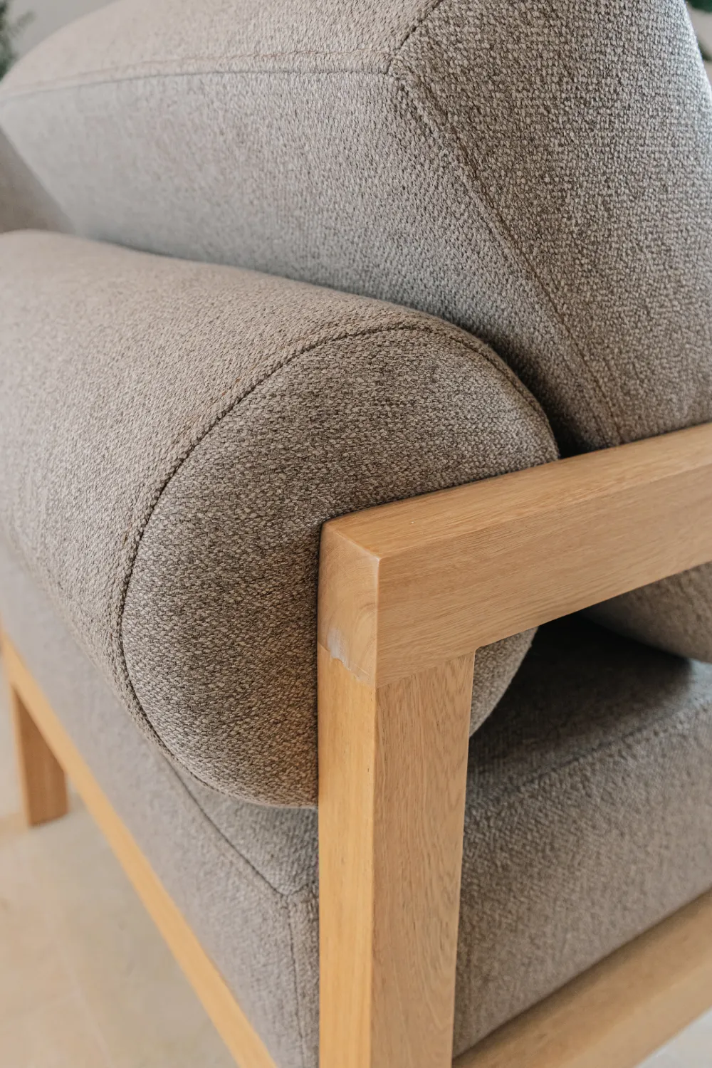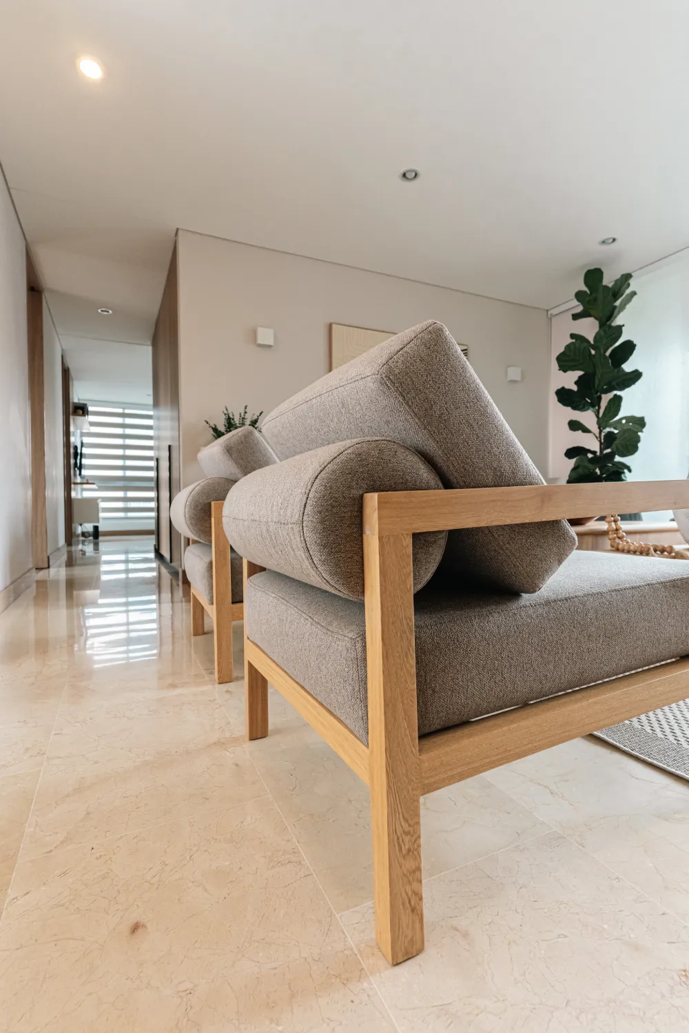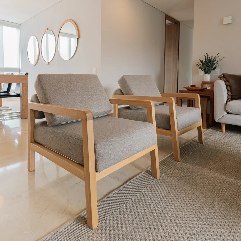 Silla de líneas limpias y estética moderna, fabricada en madera natural con tapizado suave y resistente. Su diseño amplio y cómodo la convierte en una pieza ideal para salas, estudios o espacios sociales. Un toque cálido y contemporáneo que eleva cualquier ambiente.