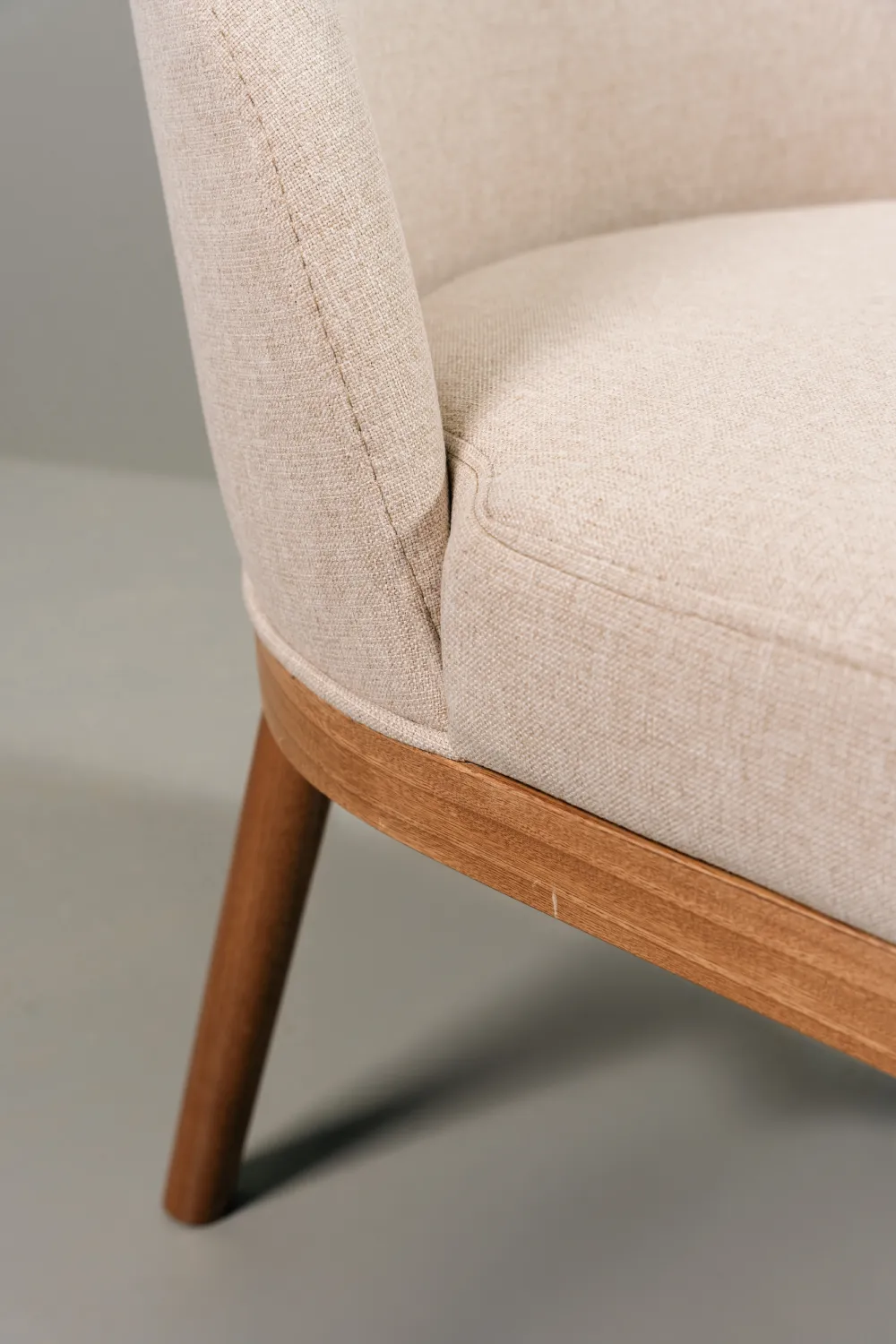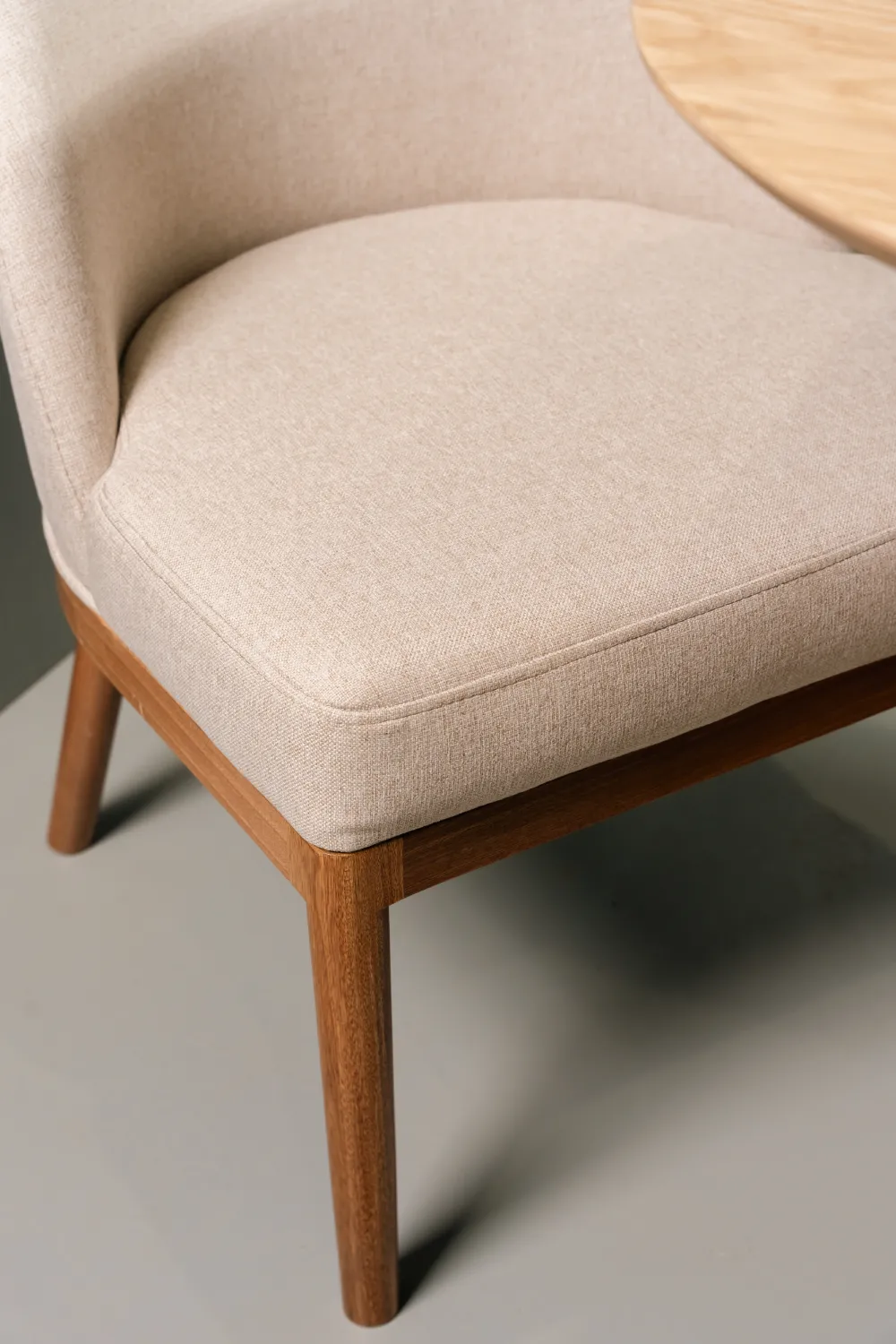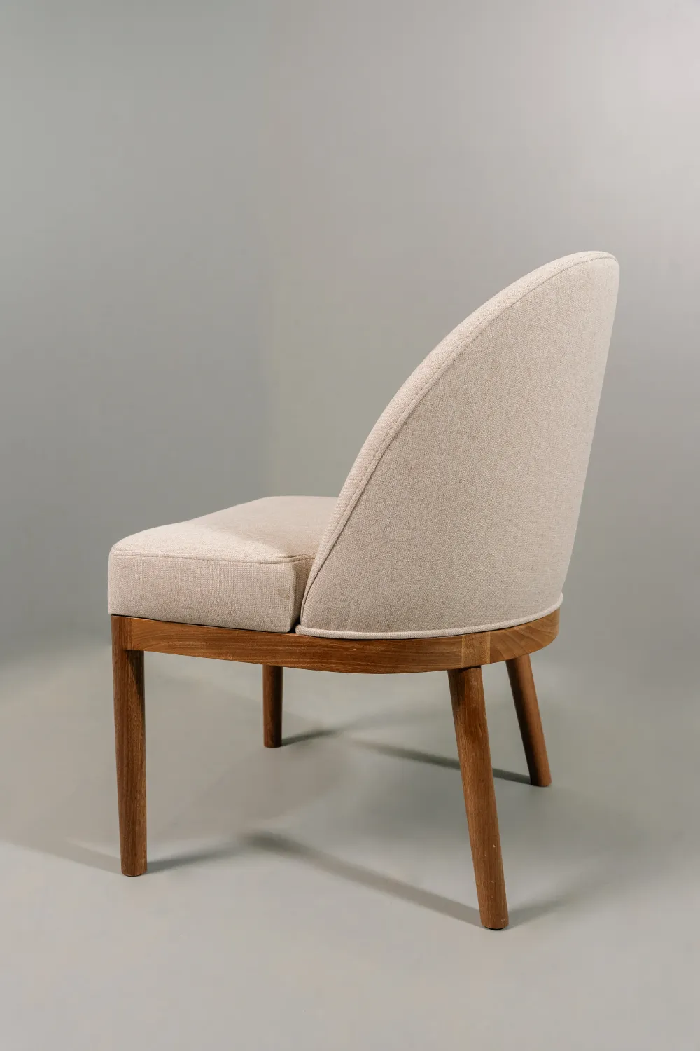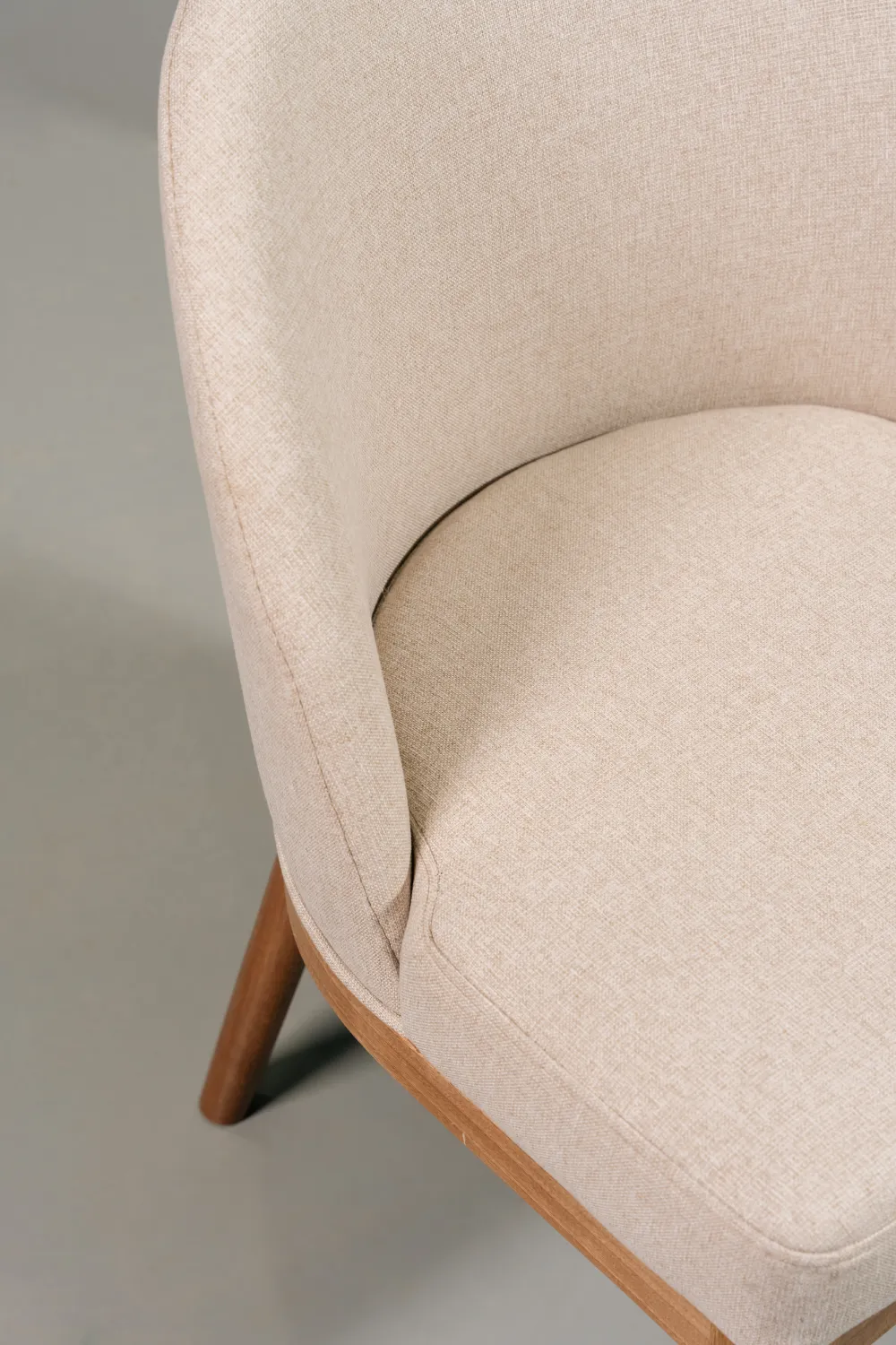Un diseño elegante y cómodo que combina la calidez de la madera con un tapizado suave en tonos neutros. Su respaldo alto y curvado brinda soporte ergonómico, mientras que su base de madera aporta resistencia y un estilo sofisticado ideal para comedores, estudios o salas modernas.
