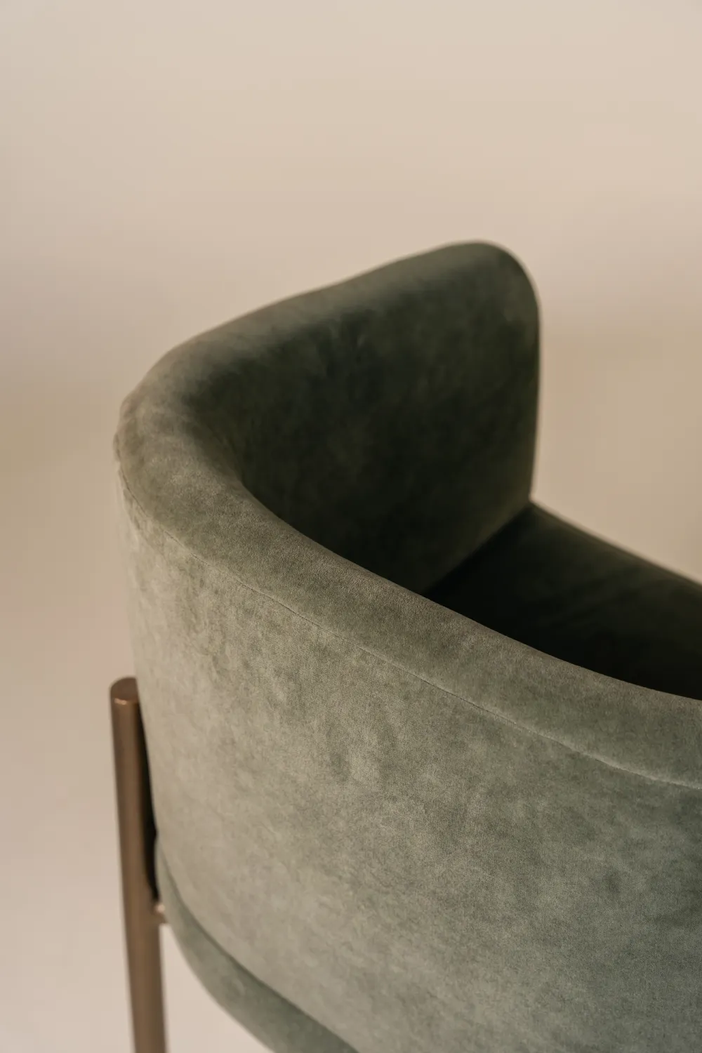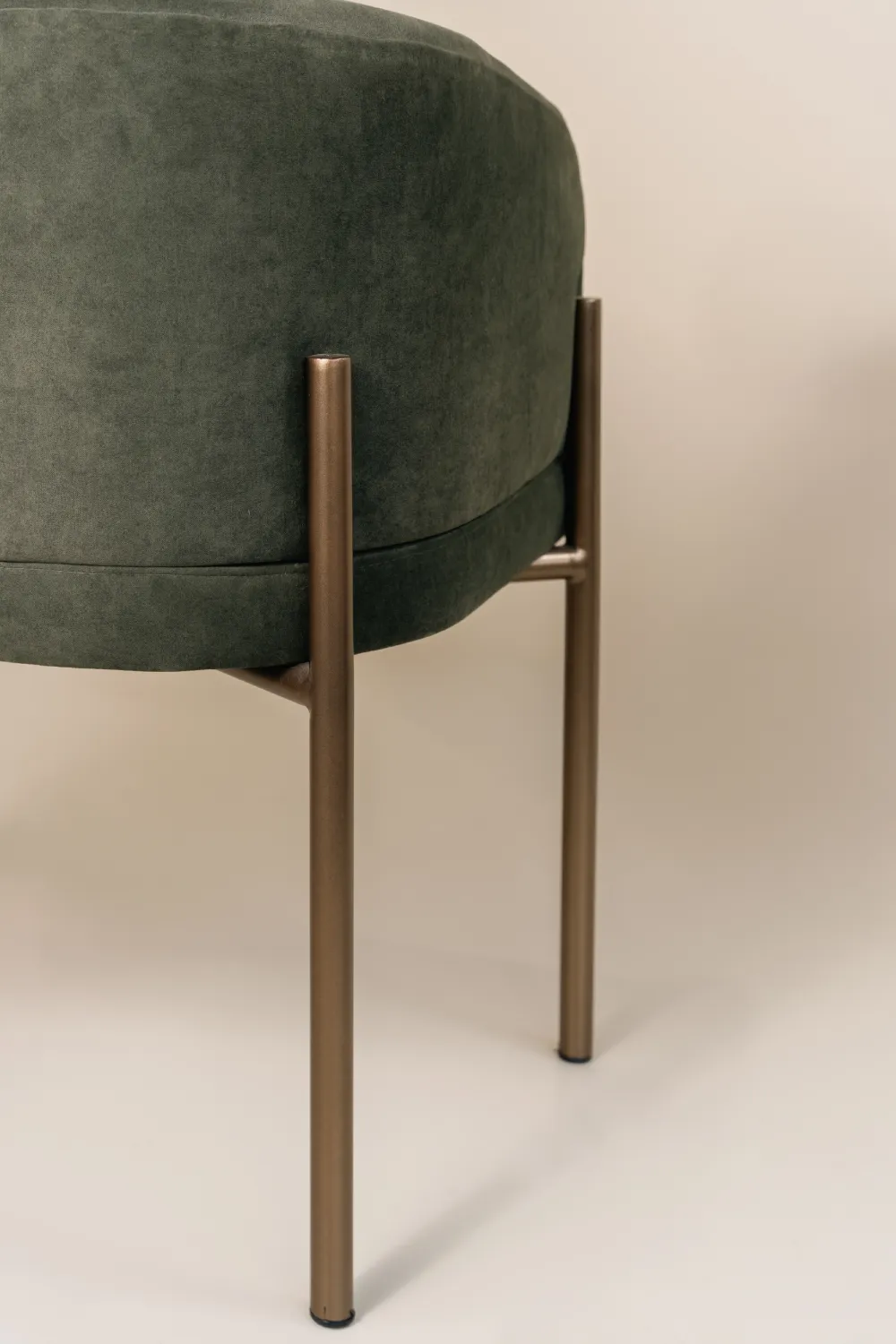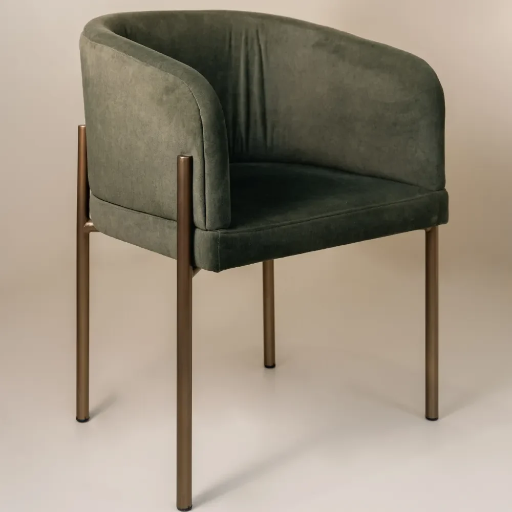 Un diseño elegante y sofisticado que combina suavidad y resistencia. Su tapizado en terciopelo verde aporta un toque lujoso y acogedor, mientras que su base metálica en acabado bronce asegura estabilidad y modernidad. Perfecta para comedores o salas que buscan un aire contemporáneo y refinado.